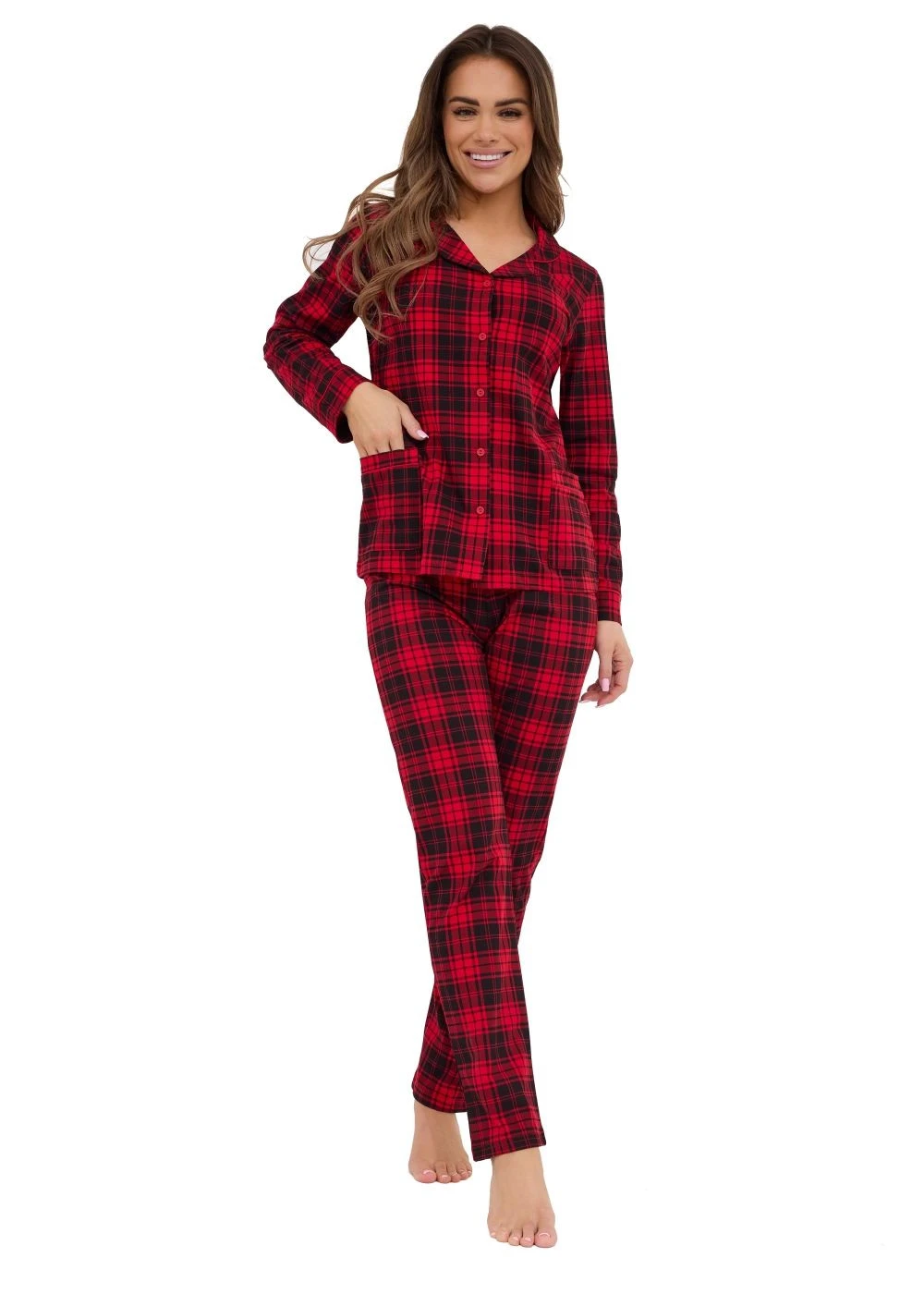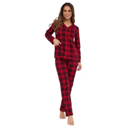 Dámské pyžamo 482/423 Tracy CORNETTE - z vysoce jakostní bavlny - červená košile s dlouhými rukávy - kapsy na bocích - zapínání na knoflíky - dlouhé kárované nohavice zakončené stahovacím lemem