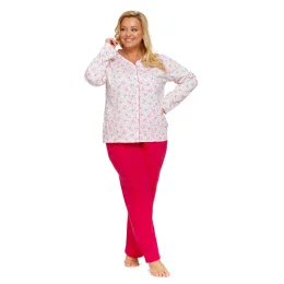 Dámské pyžamo 5282 pink plus Doctornap - z vysoce jakostní bavlny - bílá košile na zapínání a s dlouhými rukávy - s růžovým květinovým potiskem - dlouhé červené kalhoty s kapsami - certifikát OEKO-TEX Standard 100