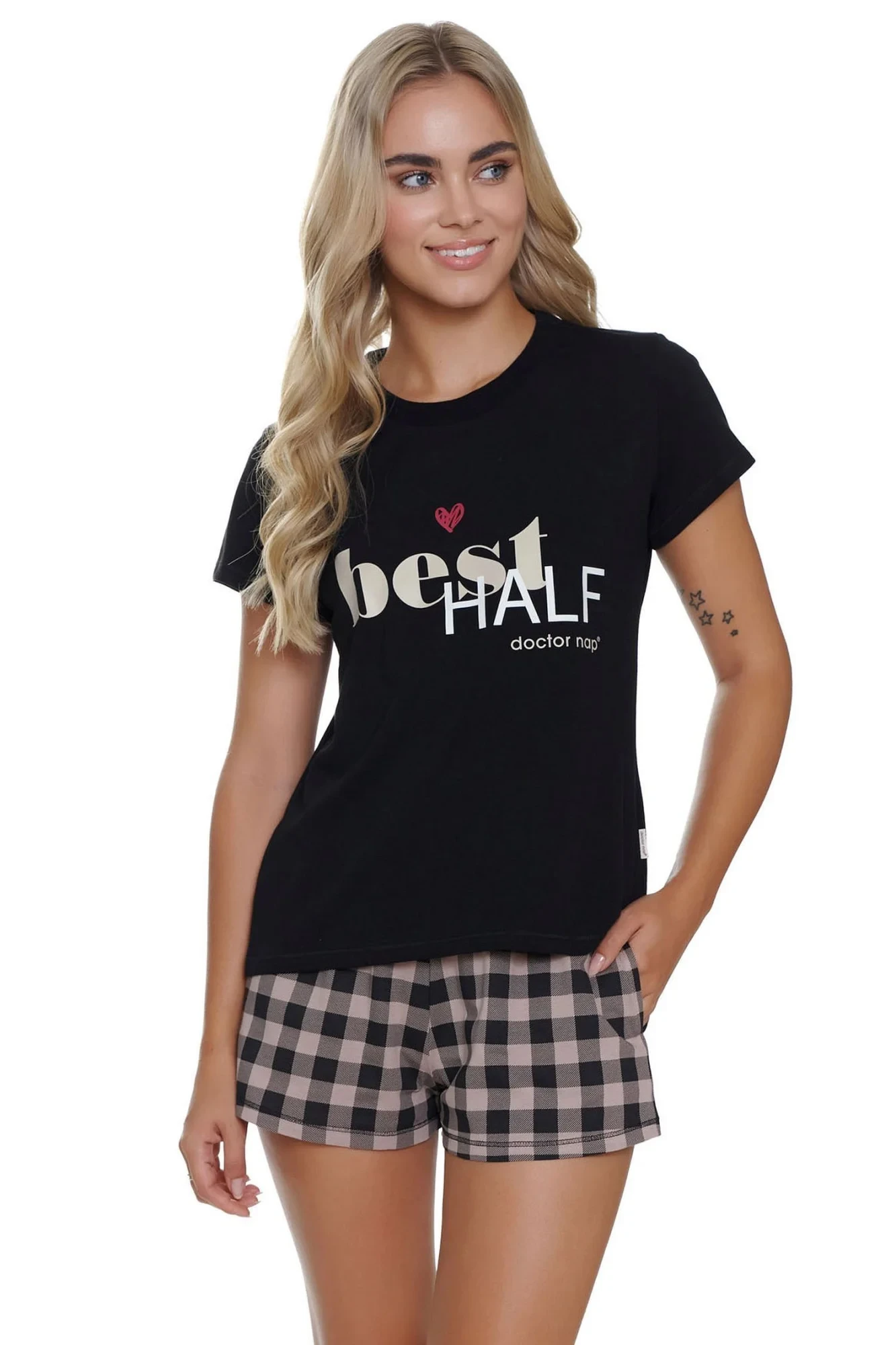 Dámské pyžamo 5341 Doctornap - z vysoce jakostní bavlny - černé tričko s krátkými rukávy - zdobené potiskem na přední straně - kárované šortky v bílo-černé barvě - s kapsami na bocích - zakončené volánky - certifikát OEKO-TEX Standard 100