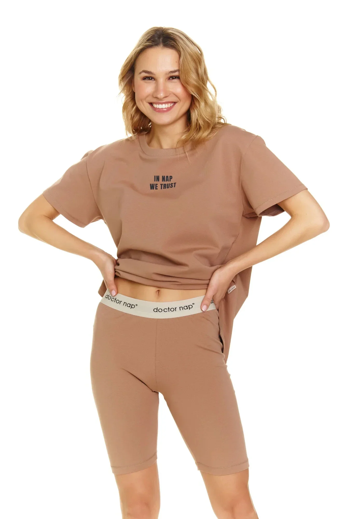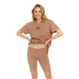 Dámské pyžamo 5382 Doctornap - z vysoce jakostní viskózy - hnědé volné tričko s krátkými rukávy - zdobené potiskem na přední straně - vypasované šortky s delší nohavičkou - elastický pas s nápisem "Doctor Nap" - certifikát OEKO-TEX Standard 100