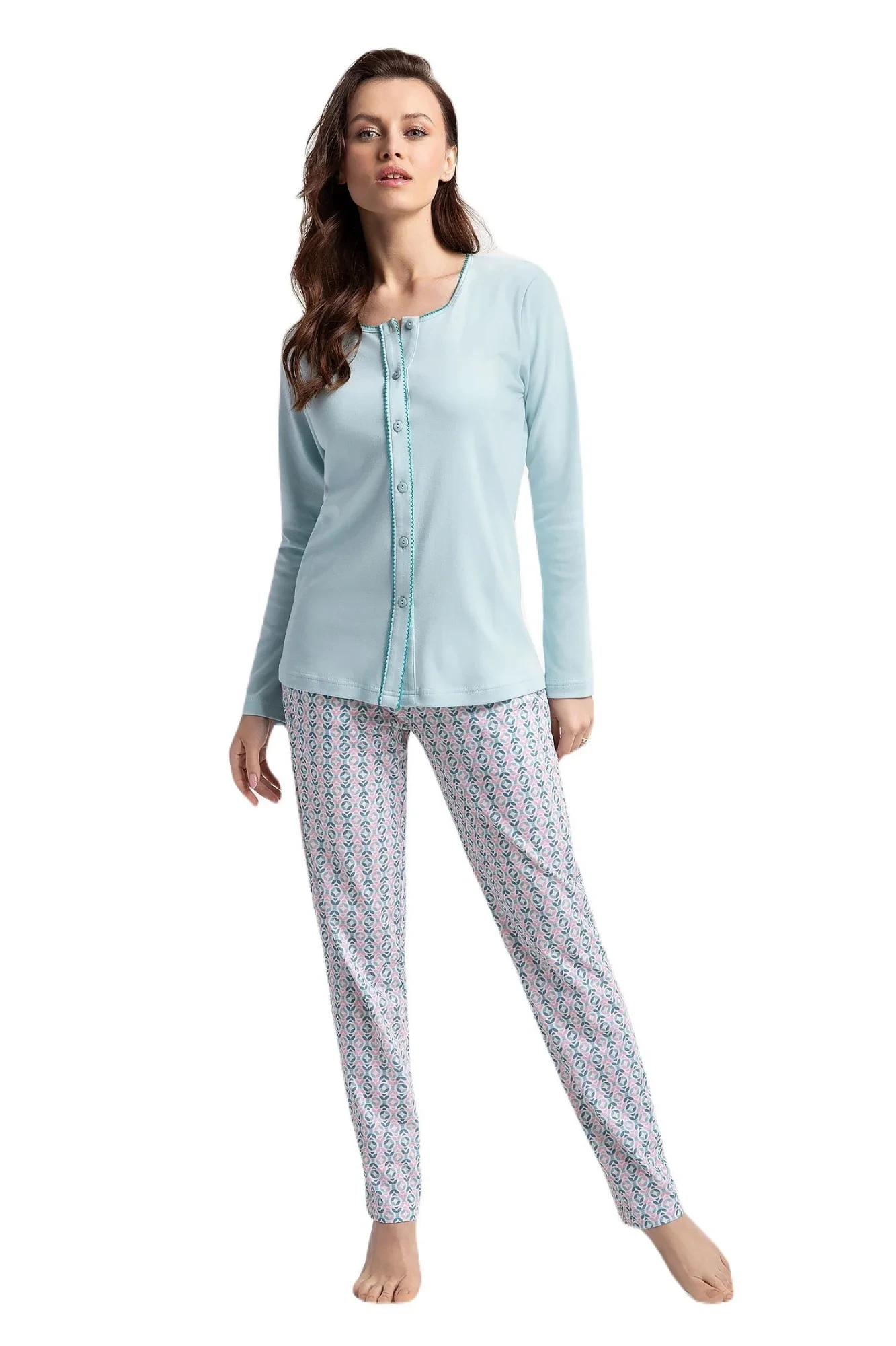 Dámské pyžamo 599 Luna - bavlněný materiál je poddajný a jemný na dotek - mátové tričko s dlouhými rukávy - zapínání na knoflíky - dlouhé vzorované kalhoty mají v pase gumu - pyžamo je vhodné i na denní nošení