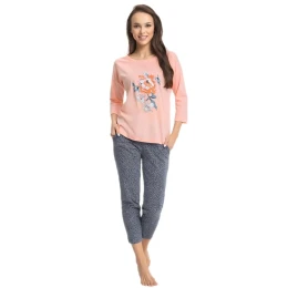Dámské pyžamo 628 Luna - bavlněný materiál je poddajný a jemný na dotek - lososové tričko s tříčtvrtečními rukávy - s barevným potiskem na přední straně - tříčtvrteční vzorované kalhoty mají v pase gumu - pyžamo je vhodné i na denní nošení