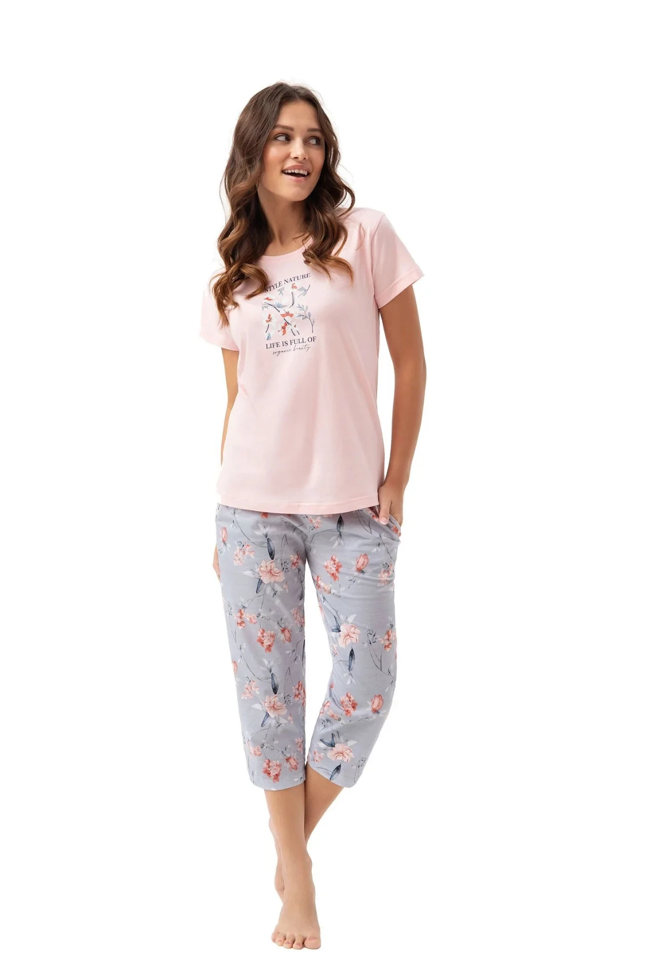 Dámské pyžamo 641 pink Luna - z vysoce jakostní bavlny - růžové tričko s krátkými rukávy - zdobené na přední straně potiskem - vzorované kalhoty s kapsami