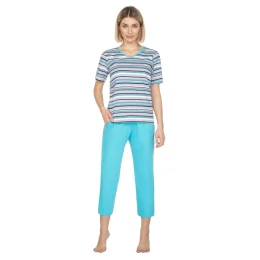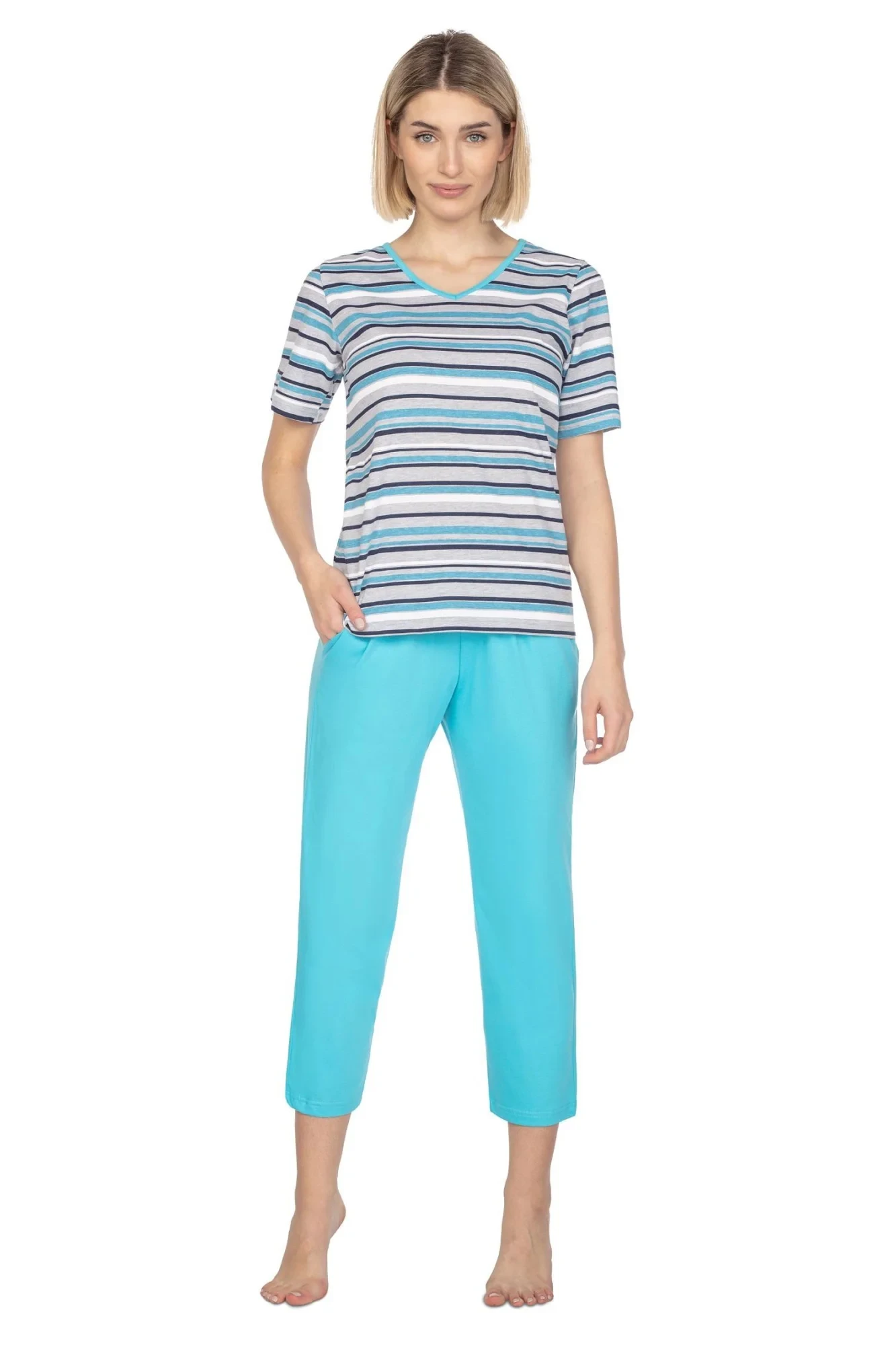Dámské pyžamo 654 turquise REGINA - tyrkysová barva - z vysoce jakostní bavlny - tyrkysové tričko s krátkými rukávy - pruhované - pohodlné jednobarevné kalhoty s pohodlnými kapsami