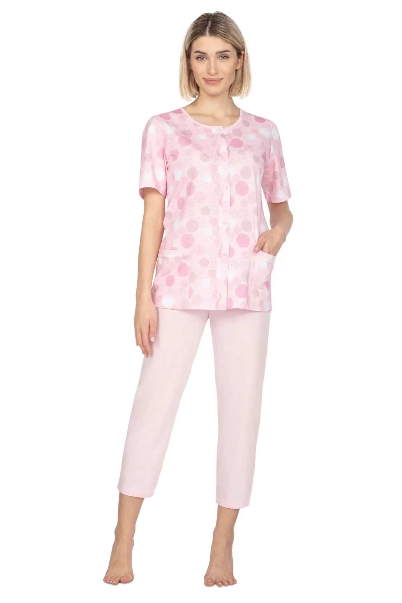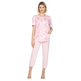 Dámské pyžamo 657 pink plus REGINA - z vysoce jakostní bavlny - růžové tričko s krátkými rukávy - se vzorem - zapínání na knoflíky - s kapsami - jednobarevné kalhoty