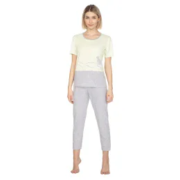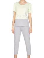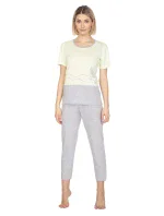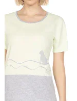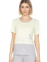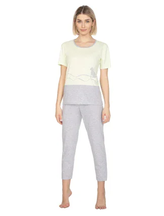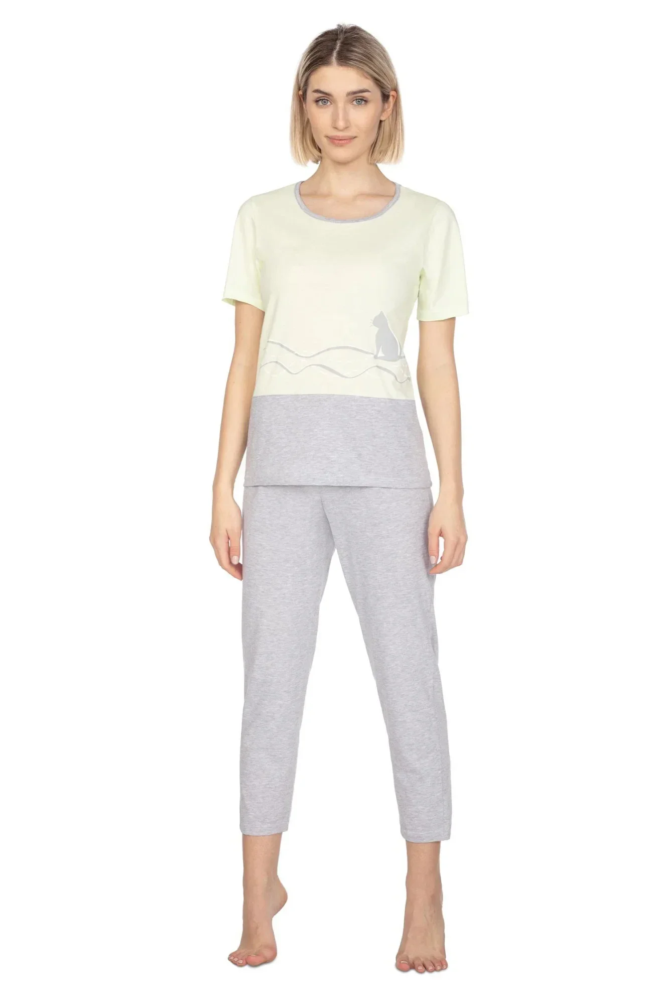 Dámské pyžamo 663 green plus REGINA - zelená barva - z vysoce jakostní bavlny - zelené tričko s krátkými rukávy - ozdobené potiskem na přední straně - výstřih, potisk a spodní část trička v barvě kalhot - pohodlné jednobarevné kalhoty