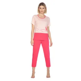 Dámské pyžamo 663 pink plus REGINA - růžová barva - z vysoce jakostní bavlny - růžové tričko s krátkými rukávy - ozdobené potiskem na přední straně - výstřih, potisk a spodní část trička v barvě kalhot - pohodlné jednobarevné kalhoty