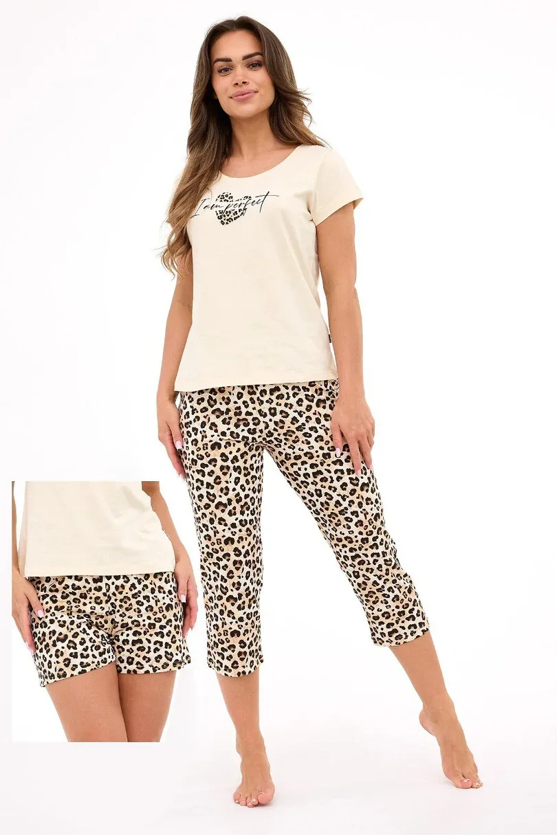 Piżama damska 665/454 I AM PERFECT 2 3-PACK to praktyczny i stylowy zestaw nocny, który zapewnia maksymalny komfort na każdą porę roku. Wykonana w 100% z wysokogatunkowej bawełny, gwarantuje przewiewność i miękkość, idealną dla delikatnej skóry. W komplecie znajduje się jednolita koszulka z krótkim rękawem i subtelnym nadrukiem na piersi oraz aż dwie pary spodni – krótkie szorty i rybaczki w modny wzór cętek. Całość zapakowana w eleganckie pudełko, co sprawia, że to świetny pomysł na prezent. Zestaw ten łączy wygodę, jakość i funkcjonalność.