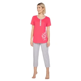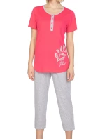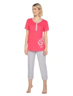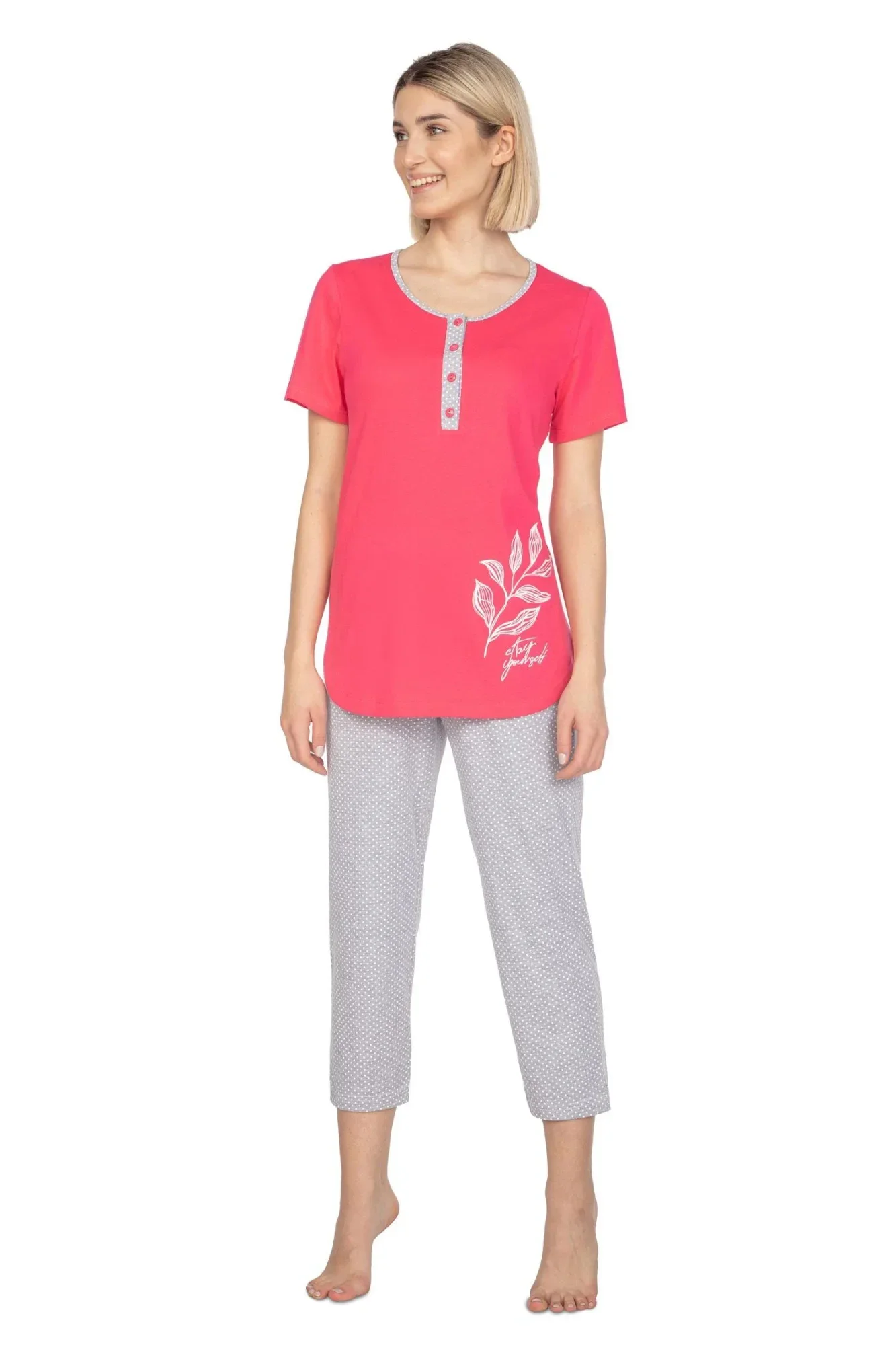 Dámské pyžamo 665 red REGINA - z vysoce jakostní bavlny - malinové tričko s krátkými rukávy - zapínání na knoflíky - zdobené potiskem na přední straně - pohodlné vzorované kalhoty
