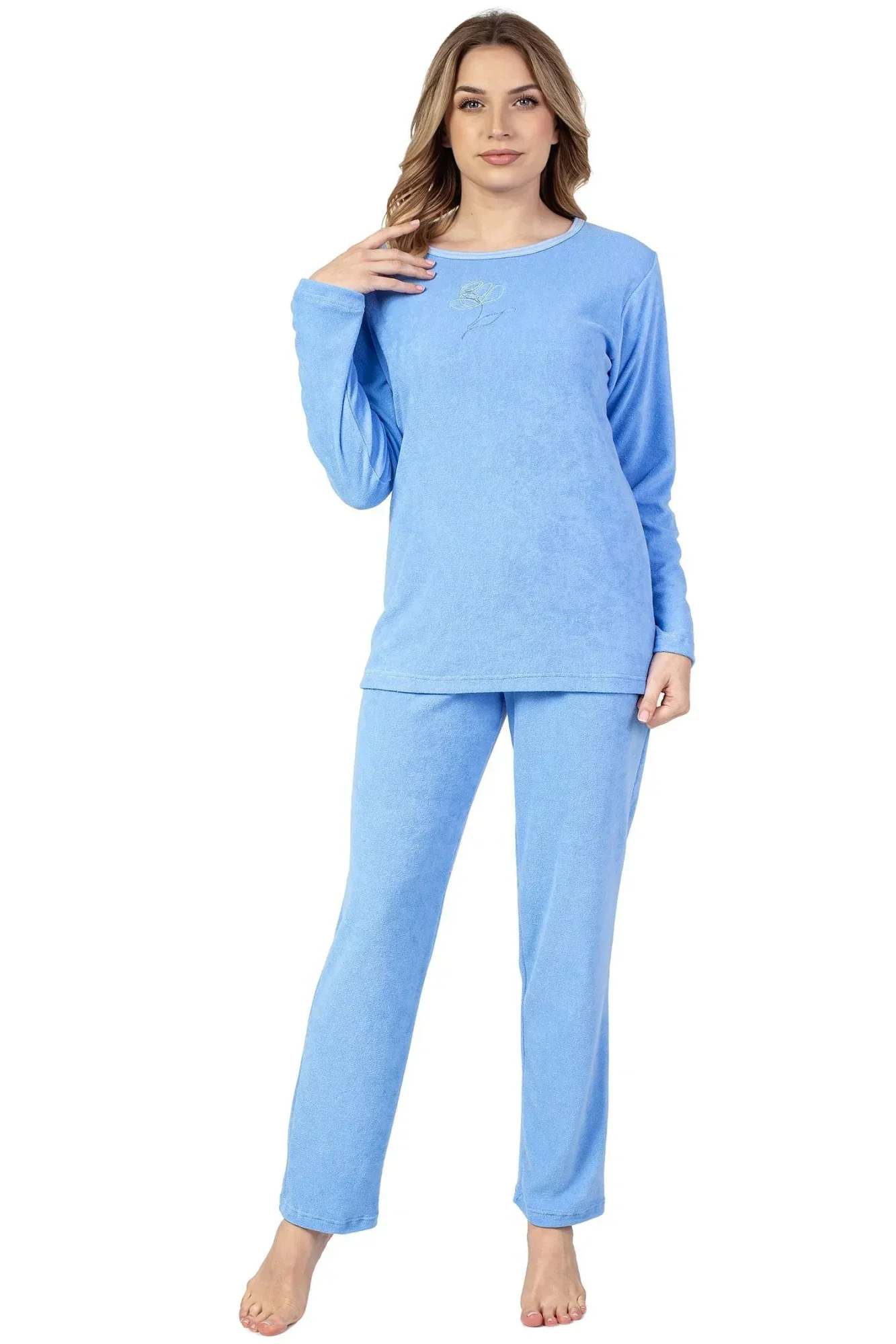 Dámské pyžamo 677 blue plus REGINA - světle modrá barva - z vysoce jakostní froté bavlny - modré tričko s dlouhými rukávy - na přední straně zdobené výšivkou - pohodlné dlouhé kalhoty modré barvy