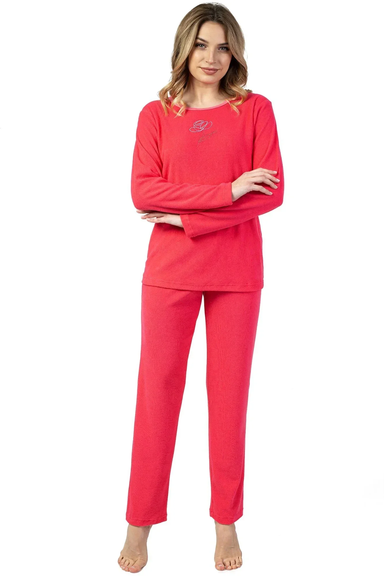 Dámské pyžamo 677 red REGINA - z vysoce jakostní froté bavlny - malinové tričko s dlouhými rukávy - na přední straně zdobené výšivkou - pohodlné dlouhé kalhoty malinové barvy