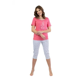 Dámské pyžamo 685 coral REGINA - z vysoce jakostní bavlny - světle modré tričko s krátkými rukávy - zdobené potiskem na přední straně - vzorované capri kalhoty
