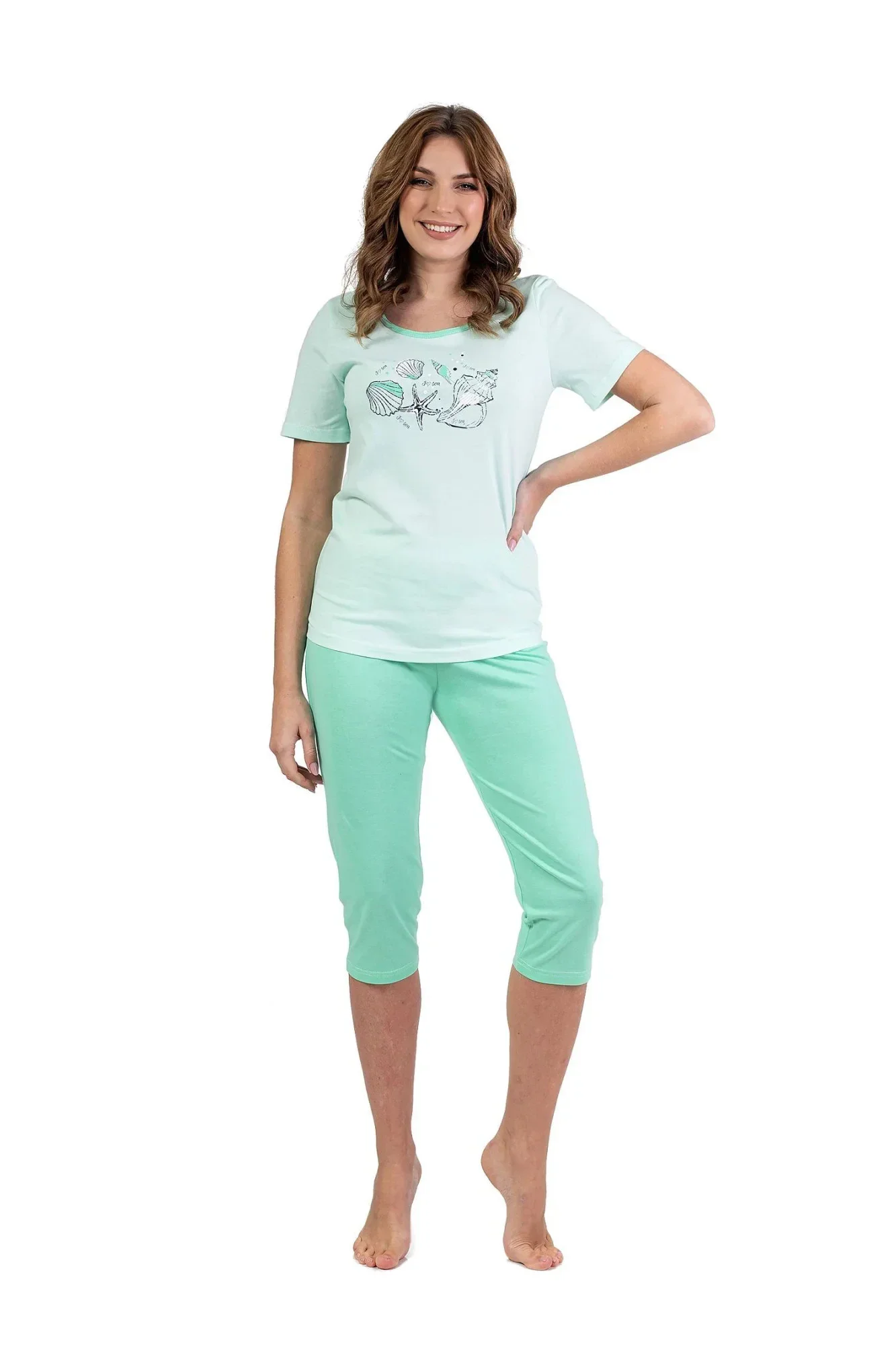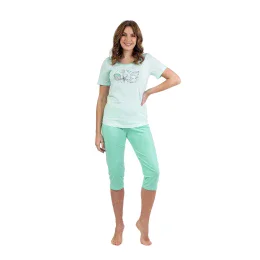 Dámské pyžamo 688 green REGINA - z vysoce jakostní bavlny - zelené tričko s krátkými rukávy - zdobené potiskem na přední straně - capri kalhoty zelené barvy