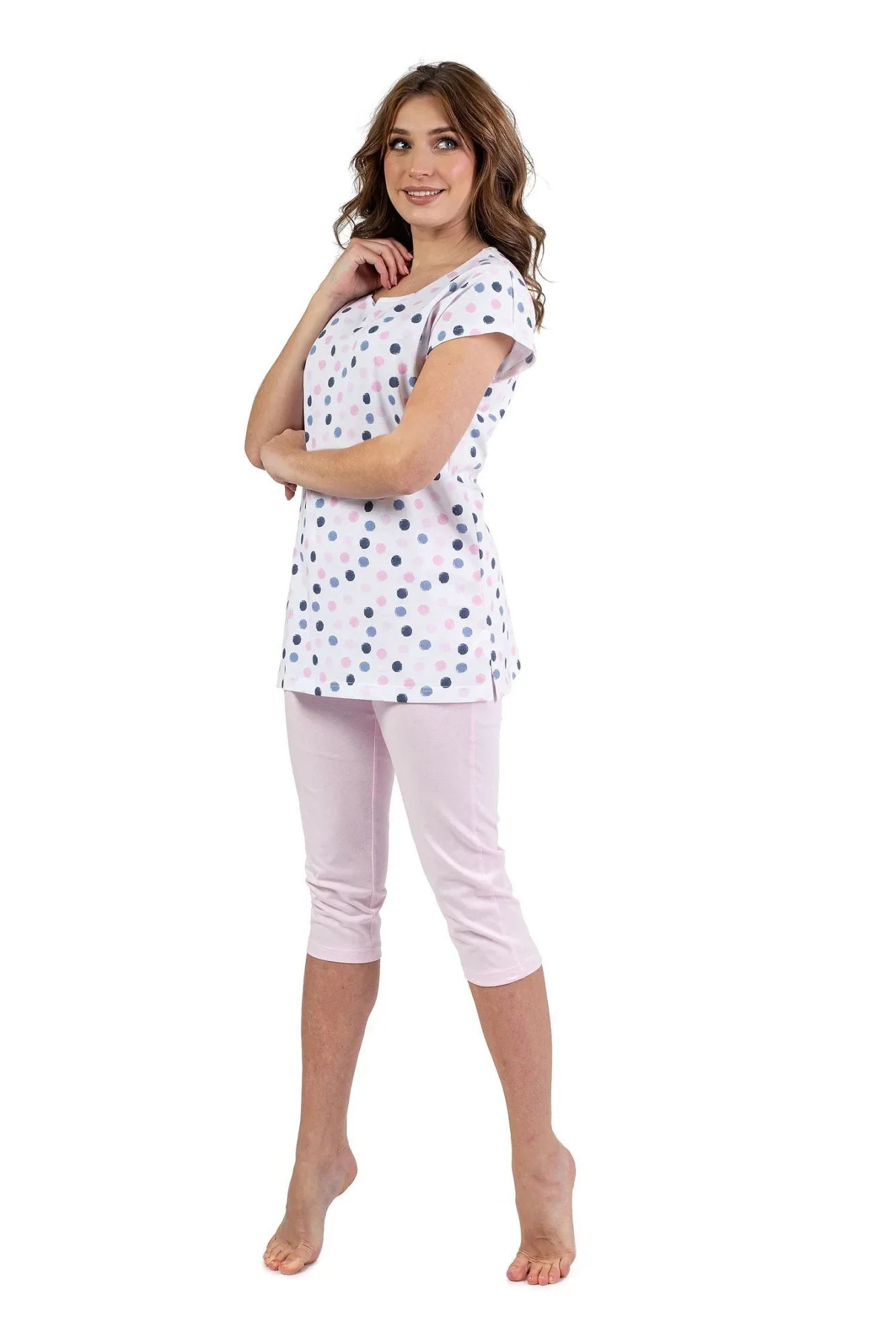 Dámské pyžamo 690 cream REGINA - z vysoce jakostní bavlny - krémové tričko s krátkými rukávy - s potiskem barevných puntíků - jednobarevné capri kalhoty