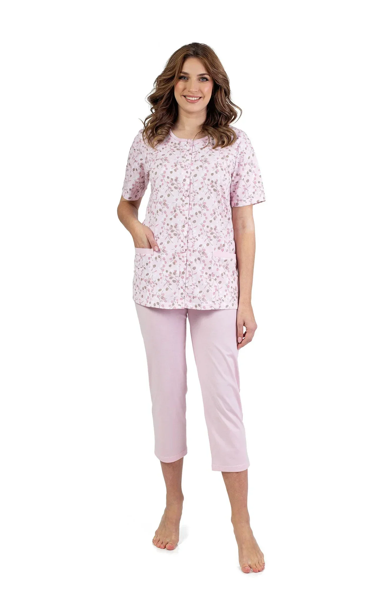 Dámské pyžamo 694 pink plus REGINA - z vysoce jakostní bavlny - růžová košile s krátkými rukávy - se vzorem květin - zapínání na knoflíky - kapsy na bocích - jednobarevné kalhoty