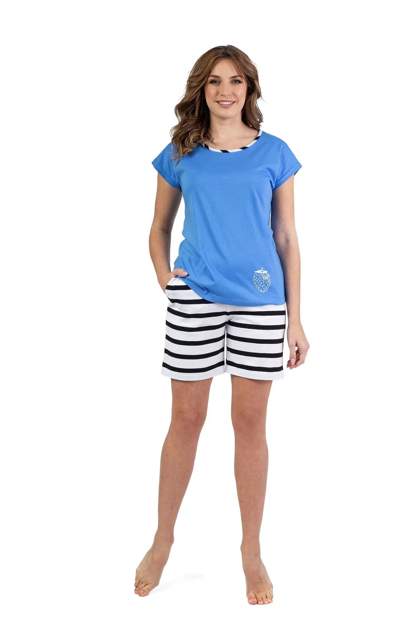 Dámské pyžamo 697 blue REGINA - z vysoce jakostní bavlny - světle modré tričko s krátkými rukávy - kulatý výstřih s pruhovaným lemováním - zdobené potiskem na přední straně - pruhované šortky