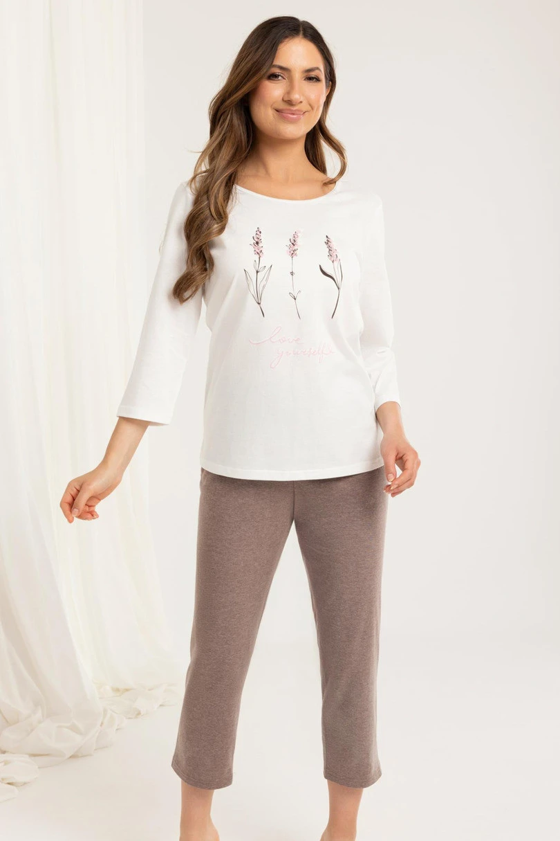 Piżama damska 703 BIG J/25 to komfortowy komplet wykonany z miękkiej, oddychającej bawełny. Koszulka z rękawem 3/4 i półokrągłym dekoltem została ozdobiona delikatnym, roślinnym nadrukiem z przodu, nadającym całości kobiecego i spokojnego charakteru. Jednolite spodnie o długości 7/8 świetnie uzupełniają zestaw, zapewniając swobodę ruchów i idealne dopasowanie. Model doskonały na wiosnę, lato oraz do codziennego relaksu w domu.