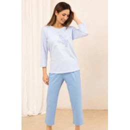 Piżama damska 706 J/25 to klasyczna i wygodna propozycja, stworzona z myślą o kobietach ceniących naturalne tkaniny i subtelny styl. Wykonana z wysokiej jakości, 100% bawełny, zapewnia pełną swobodę ruchów i doskonałą przewiewność. Koszulka z rękawem 3/4 i półokrągłym dekoltem została ozdobiona delikatnym nadrukiem z przodu, co nadaje jej kobiecego charakteru. Całość uzupełniają jednolite spodnie o długości 7/8, idealne na cieplejsze dni i wieczory.