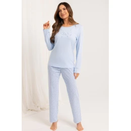 Piżama damska 708 J/25 to doskonały wybór dla kobiet ceniących wygodę i subtelny styl. Zestaw został uszyty z wysokiej jakości, 100% bawełny, która jest miękka, przewiewna i przyjazna dla skóry. Góra kompletu to klasyczna koszulka z długim rękawem, półokrągłym dekoltem i nadrukiem na przodzie. Całość uzupełniają wzorzyste, długie spodnie o luźnym kroju, które zapewniają swobodę ruchów i komfort przez całą noc.