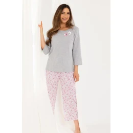 Piżama damska 711 BIG J/25 to komfortowy i stylowy zestaw stworzony z myślą o kobietach ceniących wygodę oraz subtelny design. Wykonana w całości z wysokiej jakości bawełny, zapewnia oddychalność i miękkość przy każdym ruchu. Koszulka z rękawem 3/4, półokrągłym dekoltem i kwiatowym nadrukiem z przodu prezentuje się kobieco i elegancko. Całość uzupełniają wzorzyste spodnie o długości 3/4 – idealne na wiosnę i lato.
