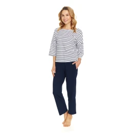 Dámské pyžamo 7122 Doctornap - z vysoce jakostní bavlny - bílé tričko s krátkými rukávy - s modrými pruhy - na přední straně potisk - kraťasy modré barvy s kapsami - certifikát OEKO-TEX Standard 100
