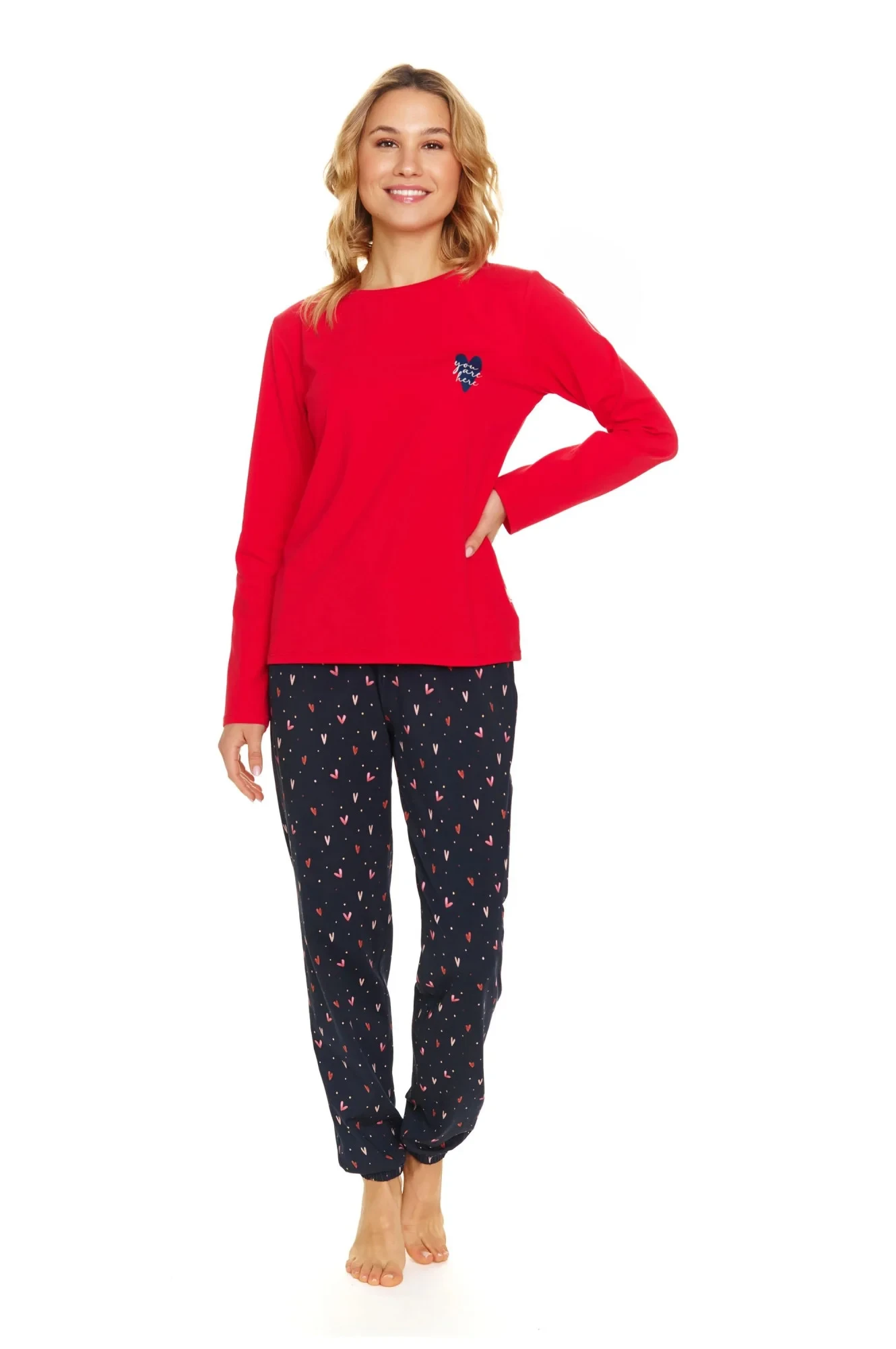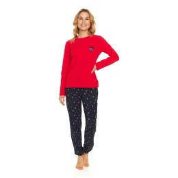 Dámské pyžamo 7130 Doctornap - z vysoce jakostní bavlny - červené tričko s dlouhými rukávy - zdobené potiskem na přední straně - vzorované dlouhé kalhoty - s kapsami na bocích - zakončené manžetami - certifikát OEKO-TEX Standard 100