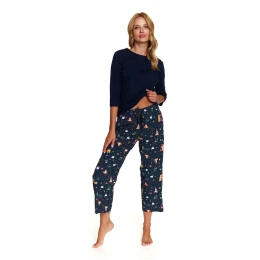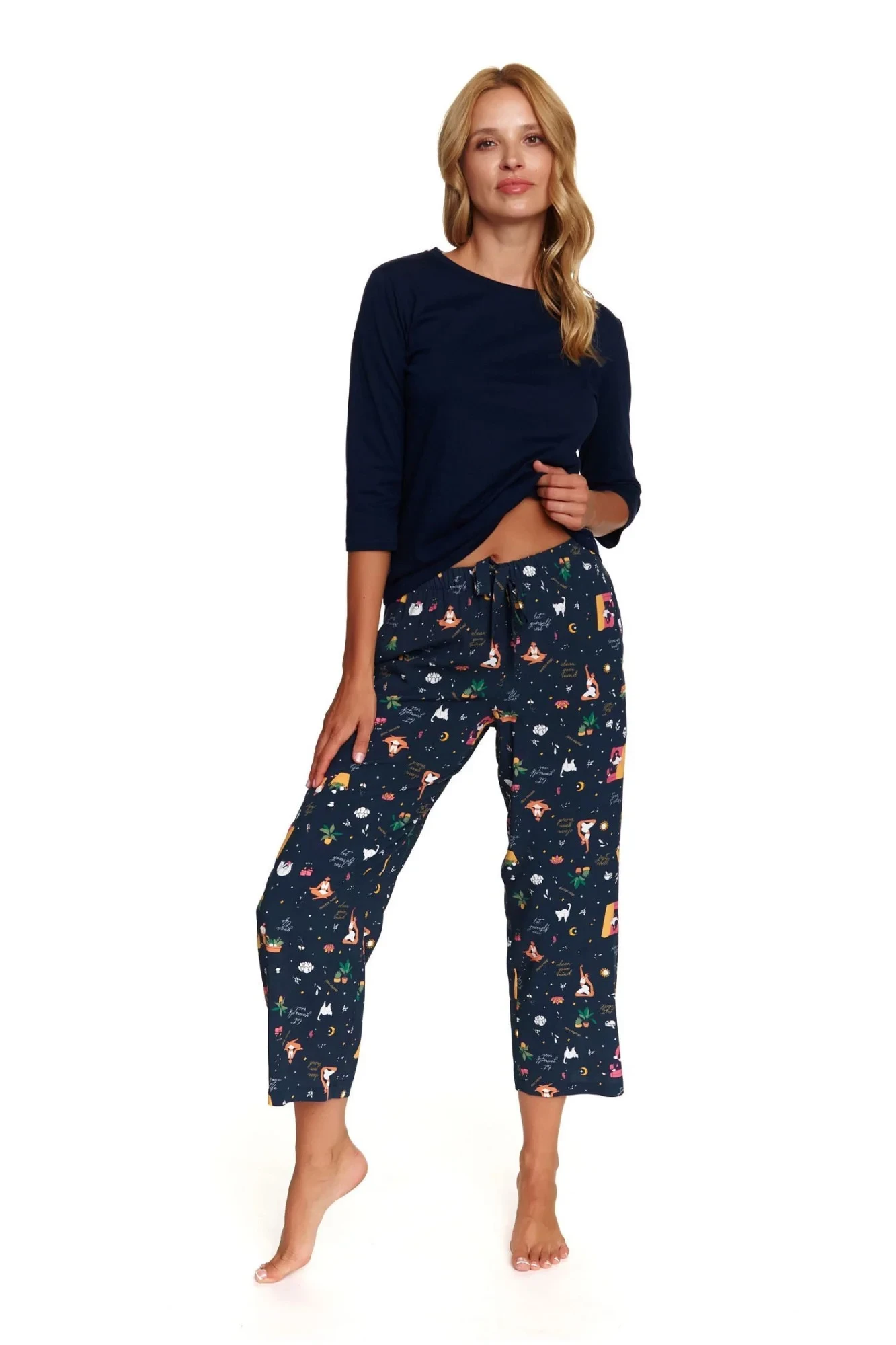 Dámské pyžamo 7162 Yoga Doctornap - tmavě modrá barva - z vysoce jakostní bavlny - tmavě modré tričko s tříčtvrtečními rukávy - vzorované kalhoty s kapsami - materiál kalhot -100% viskóza - certifikát OEKO-TEX Standard 100