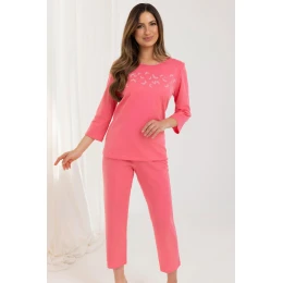 Piżama damska 724 J/25 to idealny wybór na cieplejsze noce i codzienny domowy relaks. Wykonana z wysokiej jakości, 100% bawełny, gwarantuje komfort noszenia i przewiewność. Koszulka z rękawem 3/4, półokrągłym dekoltem i ozdobnym nadrukiem z przodu prezentuje się stylowo i kobieco. Uzupełniają ją jednolite spodnie o długości 7/8, które dzięki klasycznemu krojowi zapewniają pełną swobodę ruchów i wygodę użytkowania.