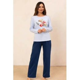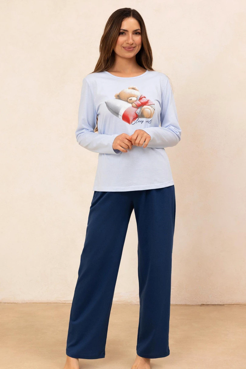 Postarejte se o teplo a pohodlí za chladných nocí s krásným dámským pyžamem 728 BIG J/25 ze 100% měkké bavlny. Tričko s dlouhými rukávy, kulatým výstřihem a roztomilým barevným potiskem medvídka na hrudi dodává sladký nádech. Dlouhé pevné kalhoty s pohodlným elastickým pasem lemovaným bavlnou zaručují dokonalé přizpůsobení bez jakéhokoli tlaku. Je to ideální volba pro ženy, které ocení pohodlí, přírodní materiály a dívčí styl. Ideální na spaní i jako pohodlná domácí souprava.