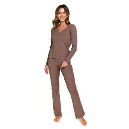 Dámské pyžamo 7304 brown Doctornap - z vysoce jakostní proužkované bavlny - hnědé tričko s dlouhými rukávy - rukávy a spodní lem zakončený volánky - kulatý výstřih ozdobený mašličkou - dlouhé volné nohavice hnědé barvy zakončené volánky