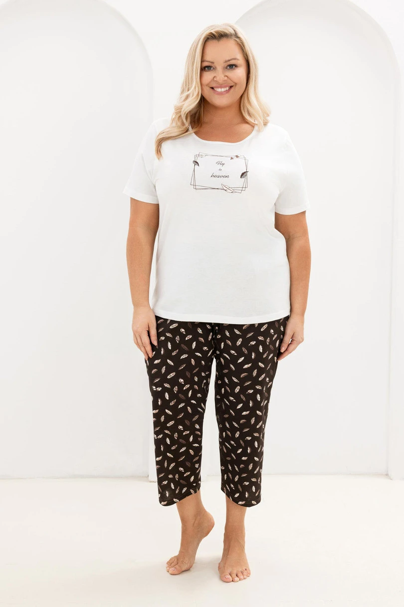 Moderní dámské pyžamo kombinující pohodlí s módním vzhledem. Souprava se skládá z trička s krátkým rukávem v jemné pastelově růžové barvě, zdobeného decentním potiskem na hrudi, a 3/4 dlouhých kalhot v kontrastním drobném vzoru. Volný rovný střih poskytuje volnost pohybu a pohodlí při spánku i domácím odpočinku. Pyžamo bude ideální po celý rok, zejména v teplejších dnech, pro ženy, které ocení kombinaci stylu a pohodlí.