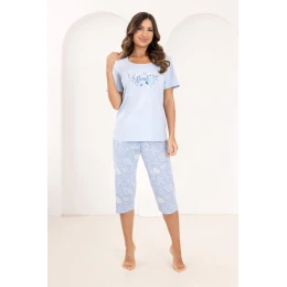 Dámské pyžamo REGINA 737 W/26 je ideální volbou pro ženy, které si cení pohodlí, přírodních materiálů a jemné estetiky. Je vyrobeno z vysoce kvalitní bavlny, takže zajišťuje vynikající prodyšnost a pohodlí při spánku i domácím odpočinku. Jednoduché tričko s krátkým rukávem a půlkruhovým výstřihem zdobí na přední straně jemný potisk, který dodává celé soupravě ženský nádech. 3/4 dlouhé kalhoty zaručují volnost pohybu a díky nim je souprava ideální pro celoroční nošení.