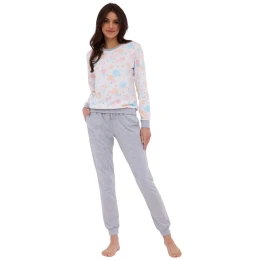 Dámské pyžamo 740/379 Star 2 CORNETTE - z vysoce jakostní bavlny - bílé tričko s dlouhými rukávy - se vzorem - dlouhé šedé kalhoty - šedé lemování - v pase šňůrka - pyžamo je vhodné i na denní nošení