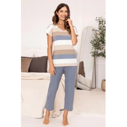 Pohodlné dámské pyžamo v klasickém, univerzálním stylu, určené pro každodenní relaxaci. Souprava se skládá z trička s krátkým rukávem zdobeného vodorovnými pruhy v jemných pastelových odstínech a hladkých kalhot s délkou 3/4. Volný střih zajišťuje volnost pohybu a pohodlné nošení po celou noc. Harmonické barvy dodávají celku klidný, elegantní charakter, takže pyžamo je ideální pro spánek i domácí relaxaci.
