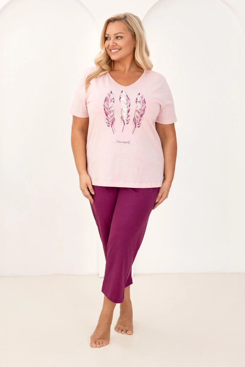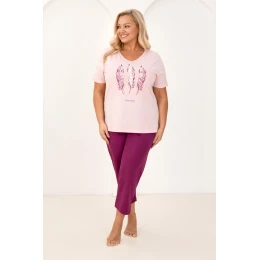 Dámské pyžamo 742 W/26 REGINA je pohodlný a žensky působící noční komplet ze 100% přírodní bavlny. Měkká, prodyšná tkanina zajišťuje pohodlný spánek a příjemný pocit na pokožce po celou noc. Tričko s krátkým rukávem a výstřihem ve tvaru písmene V jemně zvýrazňuje siluetu a ozdobný potisk na přední straně dodává celku módní charakter. Stejnokrojové kalhoty ve 3/4 délce zaručují volnost pohybu a pyžamo je ideální pro spánek i domácí odpočinek. Jedná se o ideální volbu pro ženy, které ocení klasický styl a přírodní materiály.