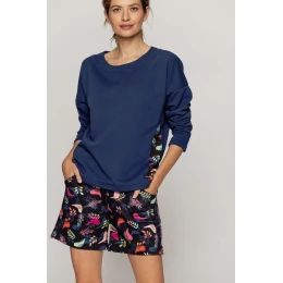 Pohodlný komplet - blůza a šortky, které jsou vyrobené z velmi kvalitní a odolné teplákoviny. Komplet je komfortní a má módní dívčí vzhled. Můžete jej nosit jako domáci oděv, ale také jako oblečení pro turistiku a sport. Blůza má dlouhé rukávy, kulatý výstřih a na bocích vzorované vsadky. Šortky jsou krátké, mají pohodlné kapsy a na bocích rozparky.