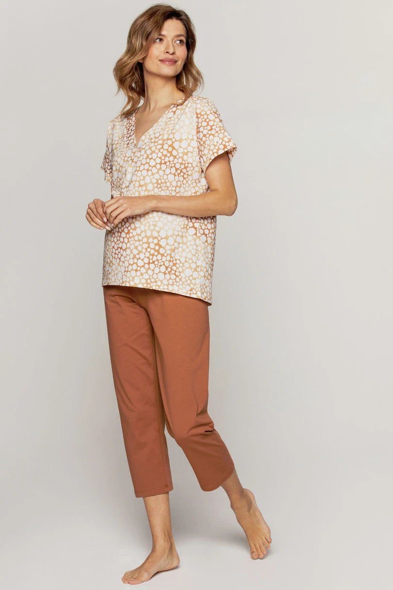 Piżama damska z wysokogatunkowej, dzianiny w nowoczesne cętki w kolorze kamelu. Pięknie uszyta, z najwyższą dbałością o detale.