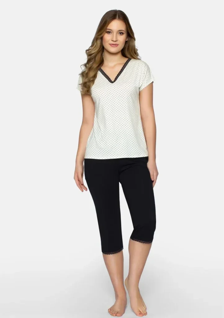 Dámské pyžamo s krátkým rukávem od značky Babella. Chcete zapůsobit na Vašeho partnera ve Vašem nočním oděvu? Pyžamo je ušito z jemného viskózového materiálu v kombinaci s krásnou kraječkou na dekoltu. Kalhoty jsou 3/4 a jsou ukončeny jemnou kaječkou. V pase je všitá pružná guma.