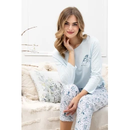 Piżama damska BOGUSIA 1639 marki Leveza to idealna propozycja na spokojne noce i wygodne poranki. Wykonana w 100% z miękkiej, oddychającej bawełny, zapewnia komfort przez cały rok. Górna część piżamy to bluzka z okrągłym dekoltem, rękawem o długości 7/8 oraz uroczym nadrukiem ptaszka. Dodatkową funkcjonalność zapewnia praktyczna kieszeń, a pastelowy odcień baby blue dodaje lekkości i kobiecego uroku. Do kompletu dołączone są spodnie 7/8 w kolorze biało-morskim z motywem ptaków i ozdobną kokardką w pasie. Dostępna w rozmiarach M–2XL.