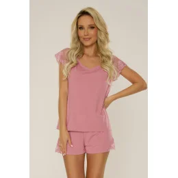 Blůza pyžama má krátké rukávy. Komplet doplňují krátké kalhoty. Rukávy, spodní okraj blůzy a boky kalhot jsou obšité krajkou.