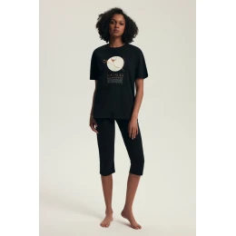 Zestaw składa się z luźnego T-shirtu z krótkim rękawem oraz spodni o długości 3/4 z elastyczną talią, które zapewniają wygodne dopasowanie bez ucisku. Całość w eleganckim, czarnym kolorze sprawdzi się nie tylko jako piżama, ale również jako stylowa odzież domowa.