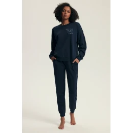 Model składa się z bluzy z długim rękawem i nadrukiem „Dream. Plan. Have Fun.”, która dodaje całości pozytywnej energii. Spodnie z elastyczną talią i praktycznymi kieszeniami zapewniają swobodę i wygodę w każdej sytuacji. Elastyczne ściągacze w nogawkach i rękawach dopełniają sportowo-lifestylowy charakter zestawu.
