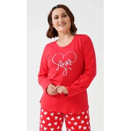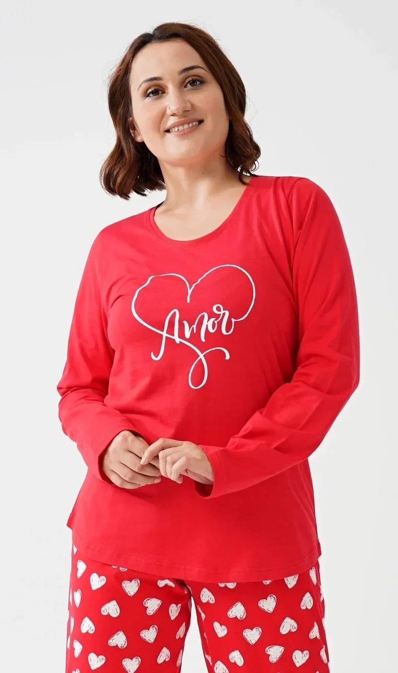 Dámské bavlněné pyžamo dlouhé Amore mio. Dámské pyžamo se skládá z trika s dlouhým rukávem a dlouhých kalhot. Triko je jednobarevné - červené s potiskem bílých srdíček. Jednobarevné kalhoty mají gumu a šňůrkou na stažení v pase, nemají kapsy. Zdobí je nápis amore mio (my love). Použitý bavlněný materiál je poddajný a příjemný na dotek.