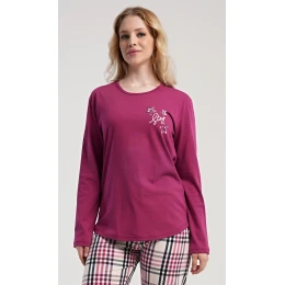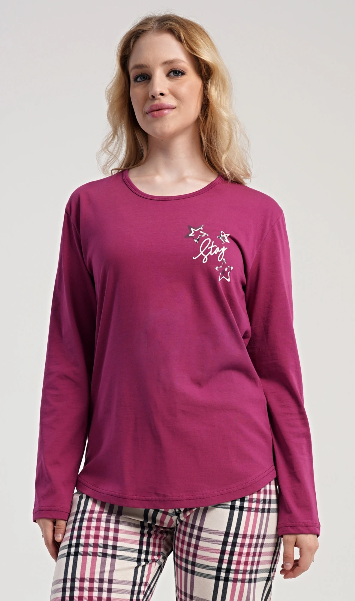 Dámské bavlněné dlouhé pyžamo Andrea. Dámské pyžamo se skládá z trika s dlouhým rukávem a dlouhých kalhot. Jednobarevné triko s kulatým výstřihem zdobí na hrudi drobný nápis a hvězdy. Kárované kalhoty mají v pase gumu a šňůrku na stažení, nemají kapsy. Použitý bavlněný materiál je poddajný a příjemný na dotek.