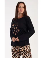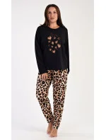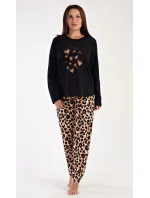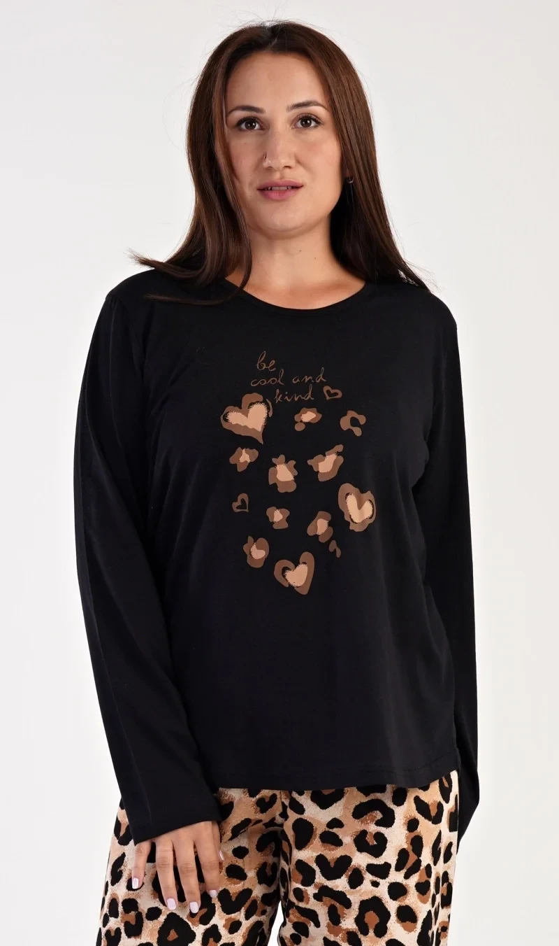 Dámské bavlněné pyžamo dlouhé Anna. Pyžamo se skládá z trika s dlouhým rukávem a dlouhých kalhot. Triko je jednobarevné, zdobené leopardím motivem a nápisem 'Be cool and kind'. Stejný motiv se opakuje i na kalhotách, které jsou v pase do gumy a na stažení šňůrkou. Použitý materiál je poddajný a příjemný na dotek. Kalhoty i triko je složeno ze 100% bavlnou.