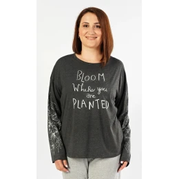 Dámské pyžamo dlouhé Berenika. Dámské pyžamo se skládá z trička s dlouhým rukávem a dlouhých kalhot. Triko je v tmavě šedé barvě se stříbrným nápisem a květinami na rukávu. Kalhoty jsou světle šedé s opakujícím se motivem jako na triku, jsou do gumy a na stažení šňůrkou. Použitý materiál s obsahem bavlny 70% je poddajný a příjemný na dotek.