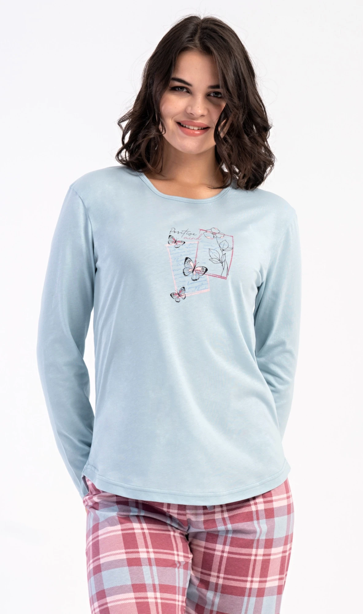 Dámské bavlněné dlouhé pyžamo Charlotte. Dámské pyžamo se skládá z trika s dlouhým rukávem a dlouhých kalhot. Jednobarevné triko s kulatým výstřihem zdobí na hrudi motýlci. Kárované kalhoty mají v pase gumu a šňůrku na stažení, nemají kapsy. Použitý bavlněný materiál je poddajný a příjemný na dotek.