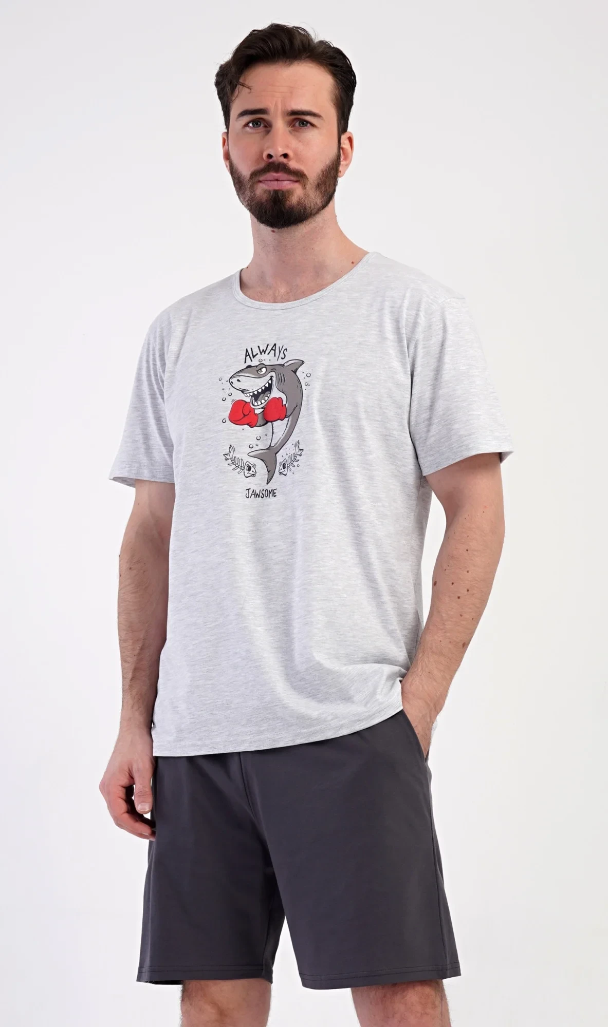 Pánské šortkové pyžamo Žralok. Pánské pyžamo se skládá z trička s krátkým rukávem a krátkých šortkových kalhot. Na tričku je obrázek žraloka. Šortky mají kapsy, v pase gumu a šňůrku na stáhnutí. Použitý materiál je příjemný a poddaný na dotek. Obsah bavlny u trička je 70% a u šortek 100%. Pyžamo je vhodné i na denní nošení a oceníte ho obzvlášť v horkých letních dnech.