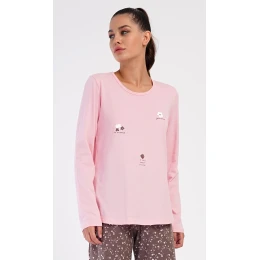 Dámské bavlněné dlouhé pyžamo Flowers. Dámské pyžamo se skládá z trika s dlouhým rukávem a dlouhých kalhot. Triko je jednobarevné, zdobené obrázky květin. Květinový potisk se opakuje i na kalhotách, které mají v pase gumu a šňůrku na stažení, nemají kapsy. Použitý bavlněný materiál je poddajný a příjemný na dotek.