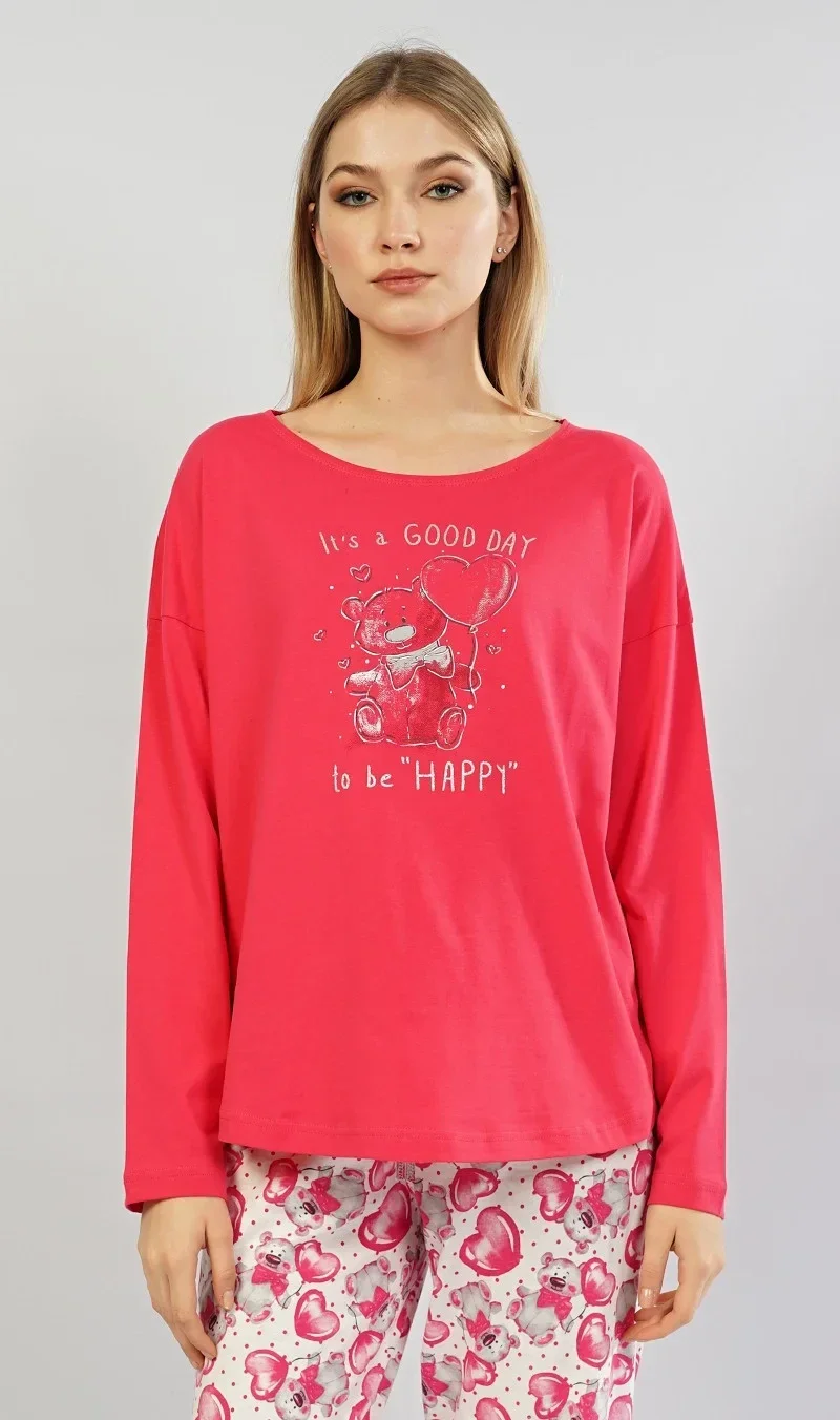 Dámské pyžamo dlouhé Good day. Dámské pyžamo se skládá z trička s dlouhým rukávem a dlouhých kalhot. Triko je jednobarevné, s obrázkem medvídka sedícího mezi srdíčky a stříbrným nápisem 'It´s a GOOD DAY to be HAPPY'. Kalhoty jsou potištěny medvídky se srdíčky. Mají v pase gumu a šňůrku na stažení, nemají kapsy. Použitý materiál je poddajný a příjemný na dotek. Triko je složeno ze 100% bavlnou u jahodové barvy a ze 70% u šedé barvy, kalhoty mají obsah bavlny 100%.